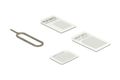 Mit diesem SIM Karten Adapter Set von Delock können Nano Sim Karten und Mirco Sim Karten adaptiert werden. Die Adapter sind sicher und praktisch in der Plastikkarte, in Größe einer Kreditkarte, aufbewahrt. Zusätzlich ist ein SIM Karten Auswurfwerkzeug im Lieferumfang enthalten.